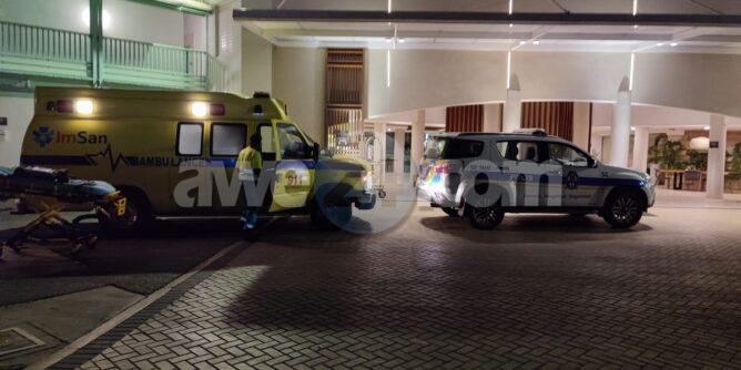 Diasabra marduga a drenta informe di un yamada for di exterior cu un dama kedando den hotel lo mester ta pasando den un caso di maltrato, mesora a dirigi patruya na e sitio. Na yegada di e patruya na e hotel a bin compronde cu aki e dama ta desea asistencia di ambulans. Na yegada di ambulans na e sitio e dama a nenga asistencia di nan. Polis a sigui intermedia y dado momento e dama turista canando den e parkinglot lo a cay y herida su rudia. A pone e dama den un rolstoel y a pidi asistencia di ambulans atrobe na e sitio. E dama lo a keda atendi pa ambulans y transporta pa hospital tambe pa ricibi tratamento. Polis a tuma datos di e incidente aki y a avisa na esnan den exterior cu e situashon ta bou control.