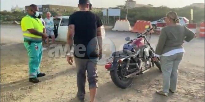 Diaranson atardi a drenta informe di un accidente cu hende levemente herida riba e caminda grandi pazuid di Palm Beach Plaza, mesora a dirigi tanto polis como ambulans na e sitio. Na yegada di e patruya ya caba ambulans tabata na e sitio y a atende e motociclista levemente heridA na e sitio mes. Locual a sosode ta cu ambos tabata bayendo zuid y e motociclista a bay pasa e auto y e auto a yega tuma un birada sin señal y sin spera a dal e motociclista bente abao y a herida su mes levemente na su pia.