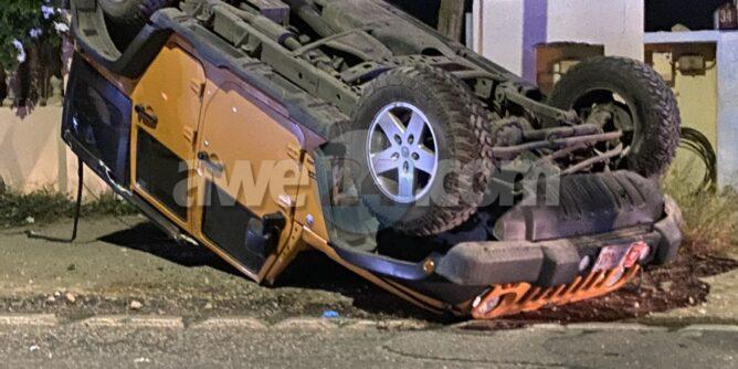 Diabierna anochi a drenta informe di un accidente basta serio unda hasta un auto a bolter, mesora a dirigi tanto polis ambulans como tambe e equipo di rescate di bombero. Na yegada di e patruya a bin compronde cu aki ta trata di un chauffeur burachi manehando un Jeep cu velocidad halto y cu a bay na su man robes, baha caminda, dal un Honda Civic staciona dilanti un cas pusha esaki dal den barancanan y finalmente bolter cu su Jeep Wrangler cu a cay parcialmente riba dje. Polis a nota un kap grandi na cabes di e chauffeur y como ela keda pega bay di e Jeep a pidi tambe pa e equipo di rescate di bombero. Na yegada di e ambulans nan a cuminsa atende e victima y na yegada di bombero a inicia cu e trabaonan pa libera e victima. Unabes cu a libere a hinke den e ambulans y a sali bay pa hospital.