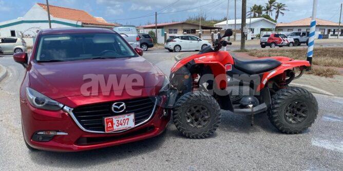 Diasabra mainta a drenta informe di un accidente na Paradera, mesora a dirigi un patruya na e sitio. Na yegada di e patruya a bin compronde cu aki ta trata di un accidente unda cu un quadracer no a duna preferencia y a bay bira na man robes dilanti un auto di direccion contrario y nan a adal den otro. Afortunadamente ningun hende a resulta herida.