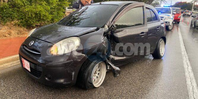 Dialuna mainta a drenta informe di un accidente net na e brug pariba di Banco di Caribe na Wilhelminastraat, mesora a dirigi un patruya na e sitio. Na yegada di e patruya a bin compronde cu e chauffeur di un Nissan March saliendo for di e rotonde a slip perde control, subi acera kap 2 tire y bay dal riba e reling di e brug. Railing cu ta net siman pasa nan a dreche despues di basta dia di un otro accidente. Despues di a dal riba e reling e vehiculo a bay bek na man drechi y keda para eynan. Afortunademente ningun hende a resulta herida.
