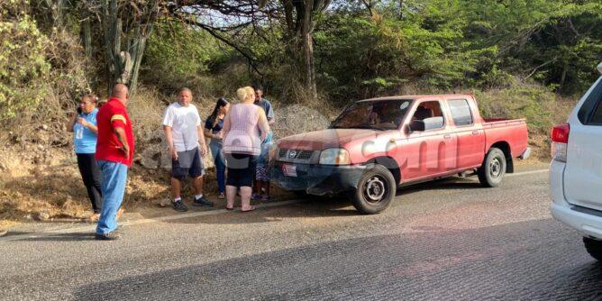 Dialuna mainta a drenta informe di un accidente den Rooi Manoonchi panort di Cayena Mall, mesora a dirigi un patruya na e sitio. Na yegada di e patruya a bin compronde cu e dama chauffeur di e pick-up Nissan Frontier bayendo nort ora di bay bira pa e subida riba e caminda muha aunke cu raspa pero toch asina mes a slip perde control bay banda robes di caminda dal riba e serito di santo. Aunke e impacto tabata fuerte afortunadamente ningun hende a resulta herida.