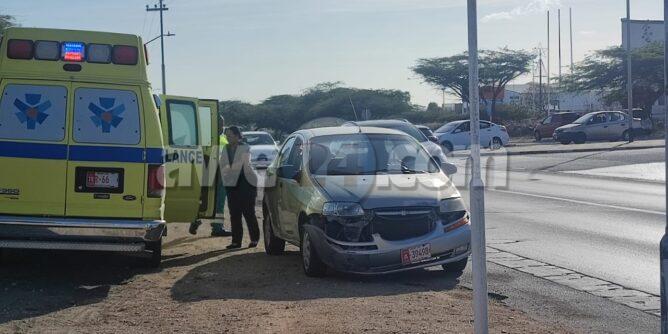 Diabierna atardi a drenta informe di un accidente cu ne levemente herida na e crusada banda di Pricesmart, mesora a dirigi tanto polis como ambulans na e sitio. Na yegada di e patruya a bin compronde cu akia raa di un accidente unda cu e dama chauffeur di e Chevrolet a bay subibcaminda pero no a mira e Nissan March biniendo for di pabao y a bay dal net riba e rim di e March. E dama chauffeur di e Chevrolet a resulta levemente herida. Na yegada di e ambulans nan a atende e victima na e sitio mes.