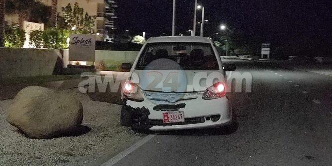 Diabierna anochi a drenta informe di un accidente dilanti Embassy Suites, mesora a dirigi un patruya na e sitio. Na yegada di e patruya a bin compronde cu aki ta trata di un accidente unda e chauffeur a baha caminda dal riba un di e piedranan grandi poni banda di caminda. Adortunadamente ningun hende a resulta herida.