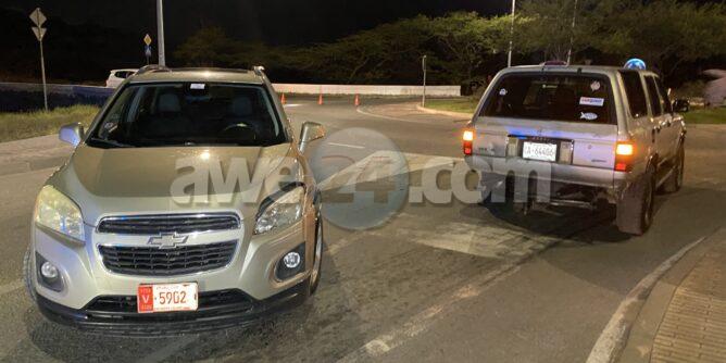 Diaranson anochi a drenta informe di cu tin un Chevrolet Trax di huur coriendo masha malo mes riba e caminda di Ponton bayendo nort mesora a cuminsa dirigi patruyanan pa e area ni un rato despues e persona informando polis ta informa cu e auto a caba di accidenta na e rotonde Noord banda di e post di e patruyanan motorisa. Na e momentonan ey e polisnan di e brigada motorisa cu tabata bayendo na e area a mira con e accidente a sosode. Nan a mira e auto subi e rotonde casi subi e isleta despues a bira na man drechi dal den banda di un Toyota 4-runner cu tabata bini di pariba para na e rotonde pa bay subi. Afortunadamente ningun hende a resulta herida. Polis a nota cu e chauffeur ta un dama di edad hulandes europeo di bishita na Aruba pero e dama tabata pata pata y polis a detene.