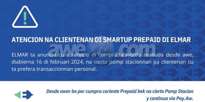 [Oranjestad, Aruba, 16 di februari 2024] – Despues cu Aruba Gas Dealers Association (AGDA) a tuma e decision riba diabierna, 2 di februari 2024, pa stop cu e servicio di benta di coriente Prepaid sin notificacion previo na ELMAR of su clientenan, ELMAR a busca activamente solucionnan pa su clientenan di SmartUp Prepaid.