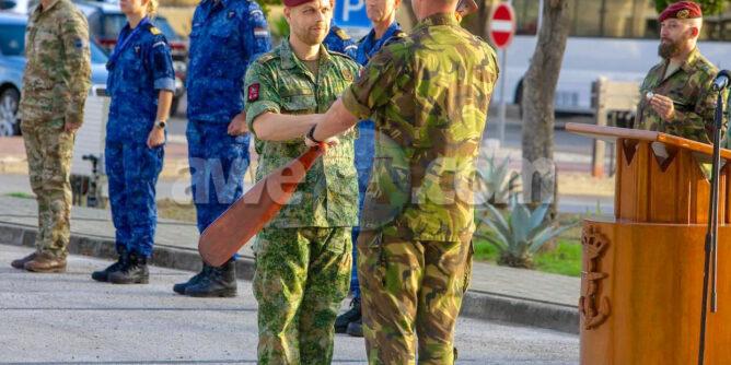Durante un breve ceremonia tradicional, e ‘Compagnie in de West’ 44 a entrega su tareanan na e siguiente unidad di rotacion 45. Na momento di entrega e rema, na 11C Tiger Company cu a despidi di su etapa na Curaçao y a pasa na yama13B Pegasus Company bonbini.