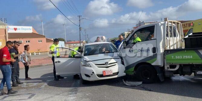 Diasabra mainta a drenta informe di un accidente cu hende herida na crusada Avenida Milio Croes cu Stadionweg, mesora a dirigi tanto polis como ambulans na e sitio. Na yegada di e patruya a bin compronde cu aki ta trata di un accidente unda e chauffeur di un pick-up a bira dilanti un Toyota Yaris di direccion contrario. Debi na e impacto e dama chauffeur di e Yaris a resulta herida. Na yegada di e ambulans nan a atende e victima y a transporte pa hospital.
