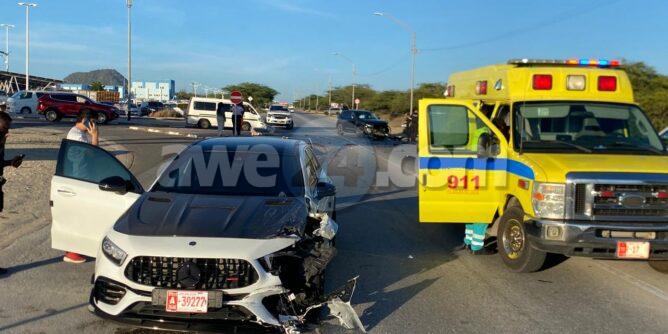 Diaranson atardi a drenta informe di un accidente cu basta daño y hende herida, mesora a dirigi tanto polis como ambulans na e sitio. Na yegada di e patruya a bin compronde cu aki ta trata di un accidente unda 3 auto ta envolvi. Segun por a compronde for di e testigonan cu ta un Mercedes biniendo pabao cu velocidad halto yegando e crusada a spanta purba brake pero a bay un poco dimas na banda robes di caminda y a dal semi frontal riba un Mazda di direccion contrario djey bay dal riba un Mitsubishi L300 para na e crusada pa subi rancando su bumper y a purba sigui bay pero a keda para un poco mas pabao. Den e Mercedes Benz tabata tin un dama di 28 aña pasahero cu ta na estado pa 8 luna y tabata keha di dolor. Na yegada di e ambulans nan a atende e dama y a transporte pa hospital. E dama chauffeur di e Mazda tambe a cuminsa haya dolor. Na yegada di un otro ambulans nan a atende e victima na e sitio mes.