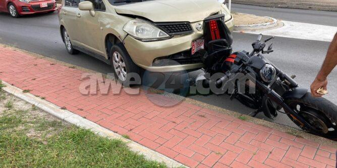 Diadomingo atardi a drenta informe di un accidente cu hende herida banda di Citgo L.G. Smith blvd., mesora a dirigi tanto polis como ambulans na e sitio. Na yegada di e patruya a bin compronde cu aki ta trata di un accidente unda e chauffeur di Nissan Tiida no a regula su velocidad ni a mantene distancia a bay dal tras di un Harley Davidson. Manera e motociclista a sinti impacto ela logra bula y evita un mal caida. Na yegada di e ambulans nan a atende e victima.