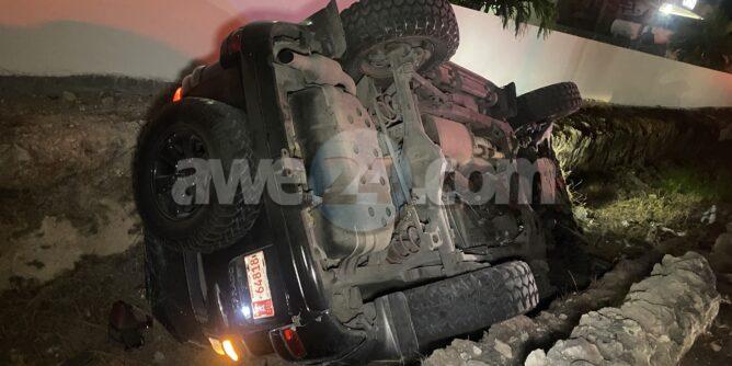 Diadomingo madruga a drenta informe di un accidente cu hende herida banda di rotonde Sasaki, mesora a dirigi tanto polis como ambulans na e sitio. Na yegada di e patruya a bin compronde cu aki ta trata di un accidente unda cu e chauffeur di un Toyota Prado saliendo for di e rotonde a bay banda robes di caminda dal un Hyundai Accent di direccion contrario den banda sigui bay na man robes bay cay den e greppel. Debi na e impacto y caida den e greppel e chauffeur a resulta herida. Na yegada di e ambulans nan a atende e chauffeur y a transporte pa hospital. Un dama den e Accent tambe tabata keha di dolor di nek y a ser atendi pa e personal di ambulans na e sitio mes.