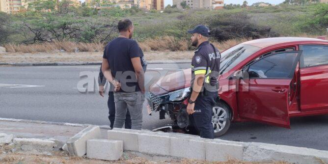 Diadomingo mainta mientras cu polis tabata atendiendo e accidente banda di Superfood un auto bayendo nort a bisa polis di un otro accidente similar pero no tin hende herida. Mesora a dirigi un di e patruyanan na e accidente pa bay na e otro accidente na rotonde Sasaki. Na yegada di e patruya a bin compronde cu un chauffeur burachi a bay dal riba e muraya di e rotonde den reparacion y blokinan a spart, polis a constata cu e chauffeur ta burachi y a detene na momento di su detencion ela resisti y un dama a bay stroba trabao di polis tambe a ser deteni. Afortunadamente ningun hende a resulta herida.