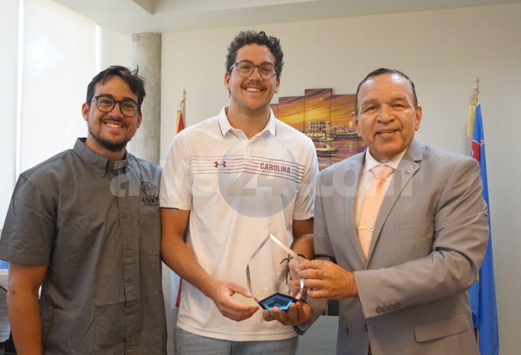 ORANJESTAD: Durante su vacacion na Aruba e hoben Patrick Groters y su ruman alabes entrenador Jordy Groters a bishita Minister di Deporte Endy Croes. Na final di luna di november y cuminsamento di december Aruba a participa den e prome edicion di Junior Panam Games 2021 cu a tuma luga na Cali, Colombia. E landado Patrick Groters a logra gana 2 medaya di oro y 1 medaya di plata cu e logro aki Aruba a termina na di cinco luga di diescuatro pais cu a gana medaya den landamento di Junior Panam Games 2021.