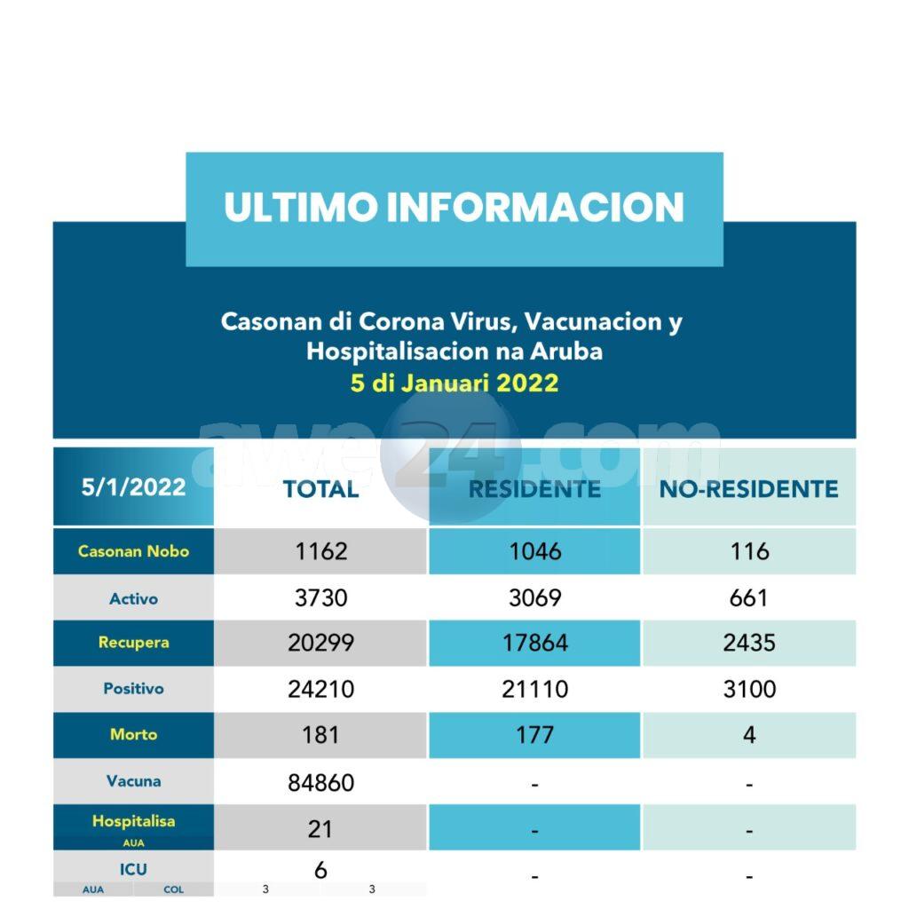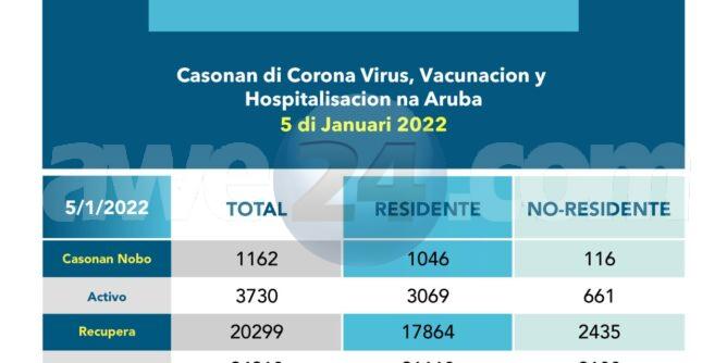 ORANJESTAD- 05 januari 2022. Segun resumen di awe 759 persona a recupera y un total di 1162 caso nobo di COVID-19 a keda registra di cual 116 ta no-residente. E cifranan aki ta representa un ‘Positivity rate’ bou di nos residentenan di 65%. E cantidad di casonan activo di COVID-19 pa awe ta 3730 y cantidad di fayecidonan relaciona cu COVID-19 ta 181. Datos ta ilustra casonan nobo di COVID cu un averahe semanal di 740 caso pa dia y un averahe di ‘positivity rate’ semanal di 63% pa dia.
