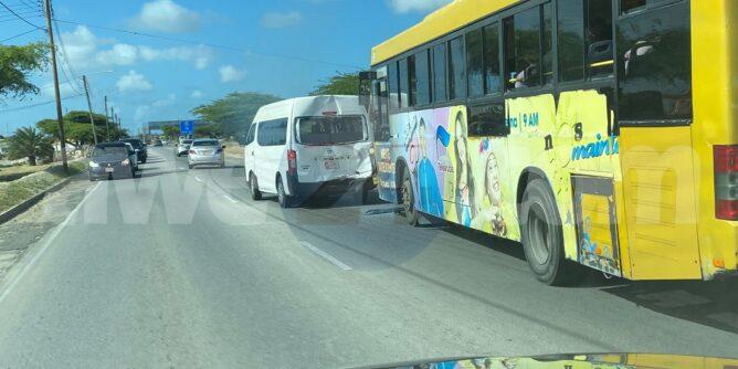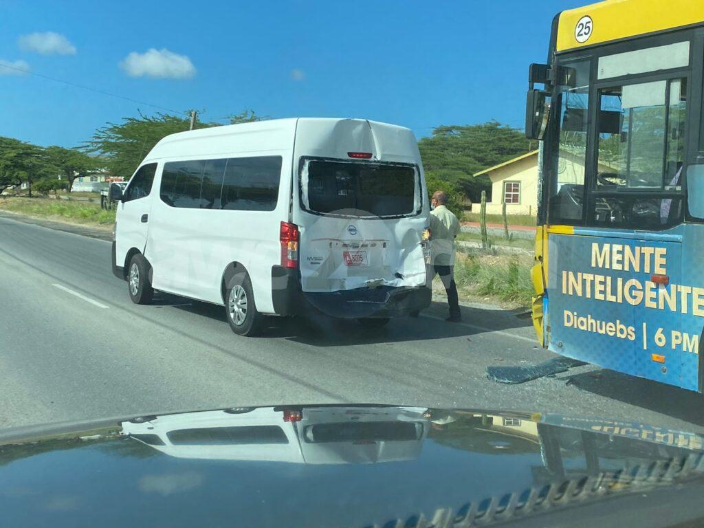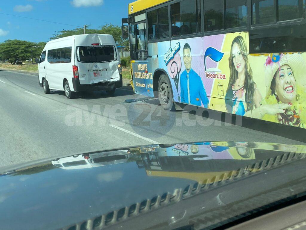 Dialuna atardi a drenta informe di un accidente unda cu un bus di Arubus a bay dal tras di un autobus na Savaneta, mesora a dirigi un patruya na e sitio. Na yegada di e patruya a bin compronde cu aki ta trata di un accidente unda cu e chauffeur di e bus di Arubus no a regula su velocidad ni a mantene distancia a bay dal tras di un autobus. Afortunadamente ningun hende a resulta herida. Un rato despues pasaheronan a cuminza keha di dolor y susto unda mester a manda ambulans y tambe slachtofferhulp! Na yegada di e ambulans nan a atende e 2 victimanan y a transporta nan pa hospital.