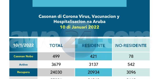ORANJESTAD- 10 januari 2022. Segun resumen di awe 1314 persona a recupera y un total di 499 caso nobo di COVID-19 a keda registra di cual 78 ta no-residente. E cifranan aki ta representa un ‘Positivity rate’ bou di nos residentenan di 65%. E cantidad di casonan activo di COVID-19 pa awe ta 3679 y cantidad di fayecidonan relaciona cu COVID-19 ta 182. Datos ta ilustra casonan nobo di COVID cu un averahe semanal di 839 caso pa dia y un averahe di ‘positivity rate’ semanal di 63% pa dia.