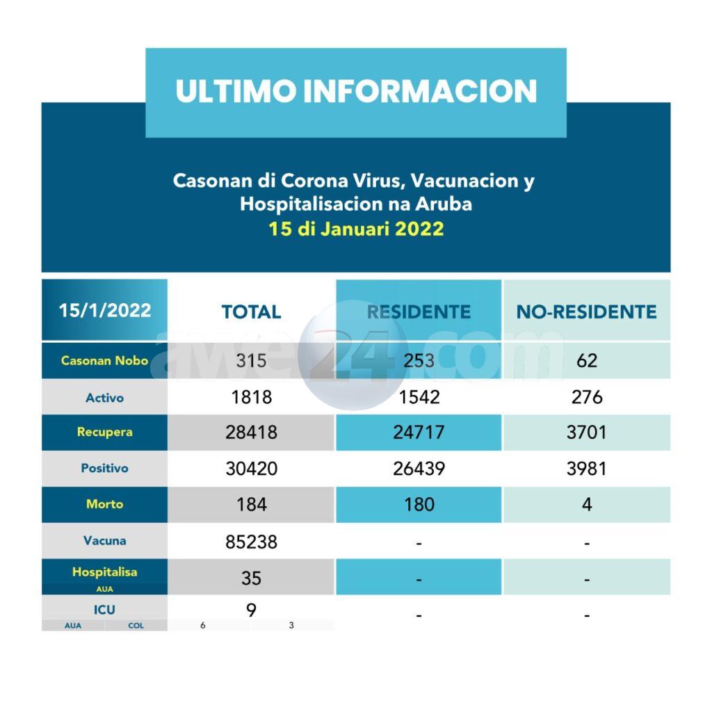 ORANJESTAD- 15 januari 2022. Segun resumen di awe 1208 persona a recupera y un total di 315 caso nobo di COVID-19 a keda registra di cual 62 ta no-residente. E cifranan aki ta representa un ‘Positivity rate’ bou di nos residentenan di 59%. E cantidad di casonan activo di COVID-19 pa awe ta 1818 y cantidad di fayecidonan relaciona cu COVID-19 ta 184. Datos ta ilustra casonan nobo di COVID cu un averahe semanal di 507 caso pa dia y un averahe di ‘positivity rate’ semanal di 62% pa dia.