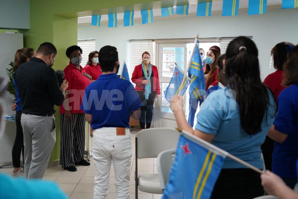 ORANJESTAD — Den cuadro di Dia di Betico, Prome Minister Evelyn Wever-Croes a bishita Scol Muchila Creativo na unda un grupo di muchanan special ta haya les parti mainta. Directora di scol Muchila Creativo, sra Rose-Marie Provance hunto cu su team y tur e muchanan, a duna Prome Minister un caluroso bon bini cantando e Himno Nacional di Aruba.