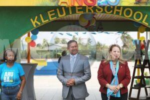 Prome Minister Evelyn Wever-Croes compaña pa Minister Ursell Arends, diaranson mainta a bishita Anglo Kleuterschoolen conexion cu nos dia nacional y tambe pa haci apertura di e speeltuin nobo. Cu esfuersonan di Aruba Doet y hopiboluntario den e siman aki, a renoba e speeltuin.