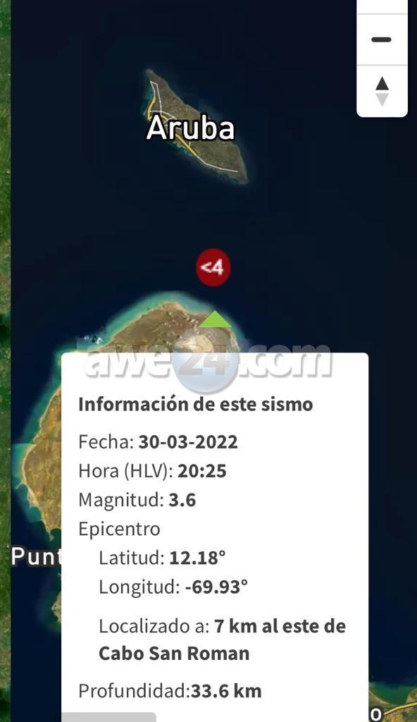 Algun minuut pasa a keda registra un temblor di 3.6 na 7 km panort di Cabo San Roman entre Aruba cu Venezuela e tabata na un profundidad 33.6 km. Nos lo sigui informa!