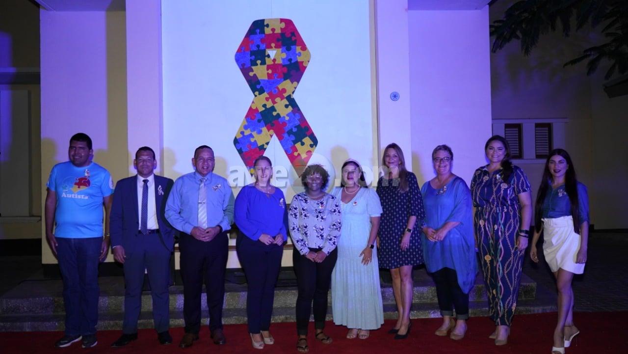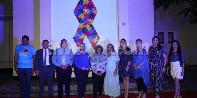 ORANJESTAD; April ta luna di conscientisacion di autismo, pa cu esaki Gobierno di Aruba hunto cu Fundacion Autismo Aruba (FAA) a uni na e causa special aki y diasabra ultimo a ilumina bestuurskantoor cu luznan blauw, hunto cu coleganan Prome Minister di Aruba Evelyn Wever – Croes y Minister di Husticia Rocco Tjon.