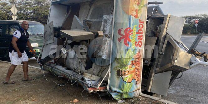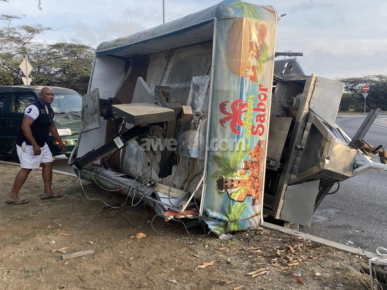 Diadomingo mainta a drenta informe di cu un snacktruck lo a bolter na e rotonde banda di Guardian Group riba E.J. “Watty” Vos blvd., mesora a dirigi un patruya na e sitio. Na yegada di e patruya a bin compronde cu aki ta trata di e snacktrailer “Caribbean Sabor cu tabata ser lastra pa un van y net na e rotonde esaki lo a bay di banda los for di e “towing ball” y bolter. Afortunadamente ningun hende a resulta herida. Cu ayudo di algun ciudadano a logra pone esaki riba su wiel pa sigui su destino. E doño a bisa di lo bay haci su maximo esfuerso pa pone bek den operacion awe mes si e logra.