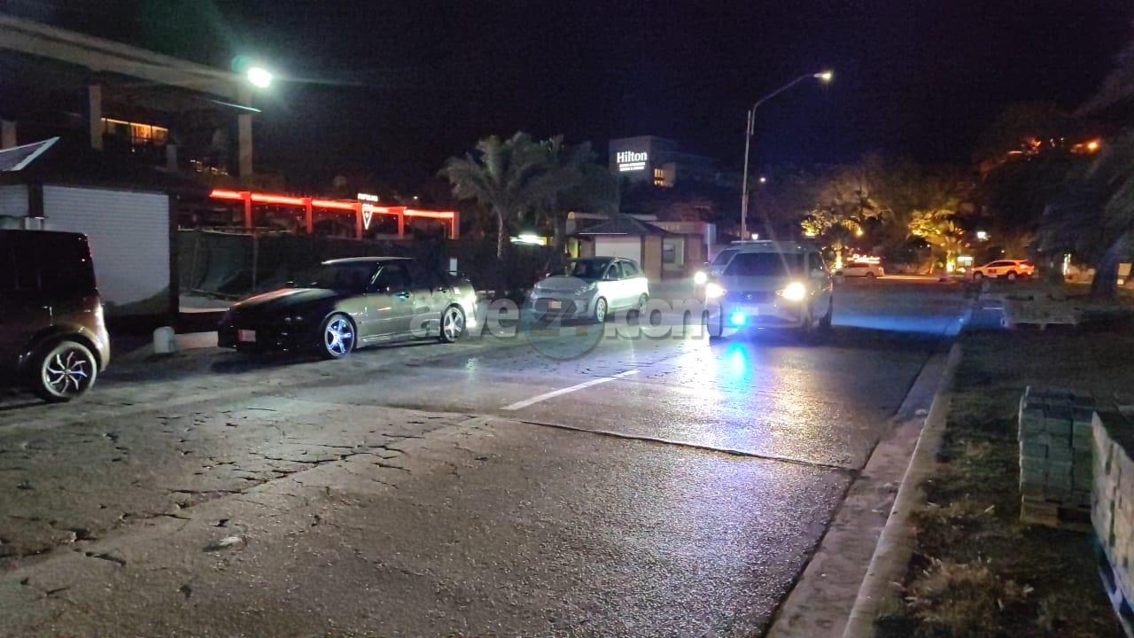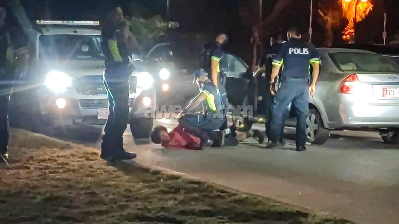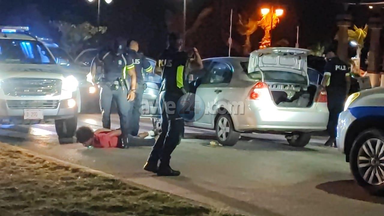 Diasabra madruga a drenta informe di un caso di menasa cu arma banda di e hotzone na e highrise hotelnan, mesora a dirigi patruyanan strategicamente na e sitio. Cu tactica polisnan a presenta riba e sospechoso bisti cu flanel cora y short shinishi den un Chevrolet Aveo shinishi y a mande plat abao y a coba den su manpurse preto y a bin descubri un arma blanco y a detene mesora.
