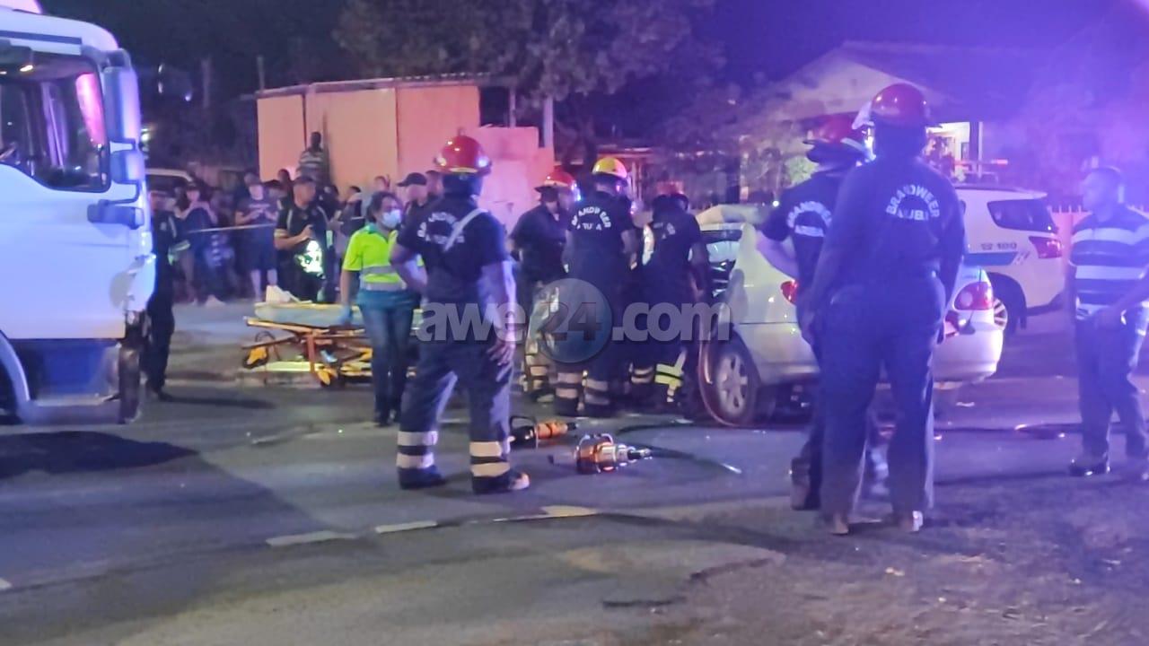 Diasabra anochi a drenta informe di un accidente basta serio cu hende herida y ega den auto na e rotonde banda di R.C.A. na Solito, mesora a dirigi tanto polis, ambulans como tambe e equipo di rescate di bombero na e sitio. Na e yegada di e patruya a tuma nota cu aki ta trata di un accidente entre un truck y un Toyota Corolla unda e truck tabata bini for di Tanki Leendert mientras e Corolla tabata bini di Hubadastraat y ambos a bini cu velocidad sin para sin tene na cuenta cu aki tin un rotonde. E truck a dal riba e Corolla pusha esaki un bon distancia for di caminda. Debi na e fuerte impacto 3 persona den e Corolla a resulta herida di cual 2 ta mucha hoben mientras e dama chauffeur a keda pega den auto. Na yegada di e ambulans nan a atende e muchanan y a transporta nan mesora pa hospital, mientras na yegada di e equipo di rescate a cuminsa cu trabaonan di rescate pa asina logra saca e dama. Despues di un rato a logra libera e dama y e personal di e di tercer ambulans a transporta e dama pa hospital. Polis di trafico a presenta como tambe e investigadornan tecnico y forensyco pa asina documenta e accidente aki.