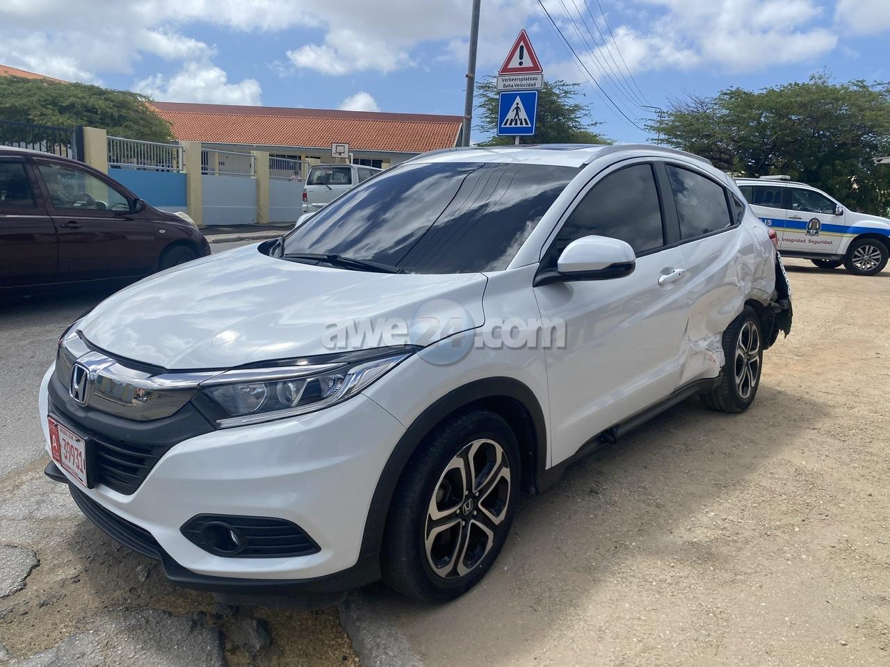 Diahuebs atardi a drenta informe di un accidente hit & run cu hende herida na e cruzada Dominicanessenstraat / Van Leeuwenhoekstraat, mesora a dirigi tanto polis como ambulans na e sitio. Na yegada di e patruya a bin compronde cu aki ta trata di un accidente unda cu un auto sedan color shinishi biniendo for di pabao den Dominicanessenstraat no a ni para pa duna preferencia na e HRV cu tabata bini nort den Van Leeuwenhoekstraat y a dal e bir’e casi 200º mand’e ful riba e plenchi dilanti Maria College. Debi na e impacto tanto e adulto na stuur, 3 mucha y hasta e cacho a ser lesiona den e accidente aki. E auto cu a ocasiona e accidente aki mes a sigui core bay direccion pariba y ni a para.