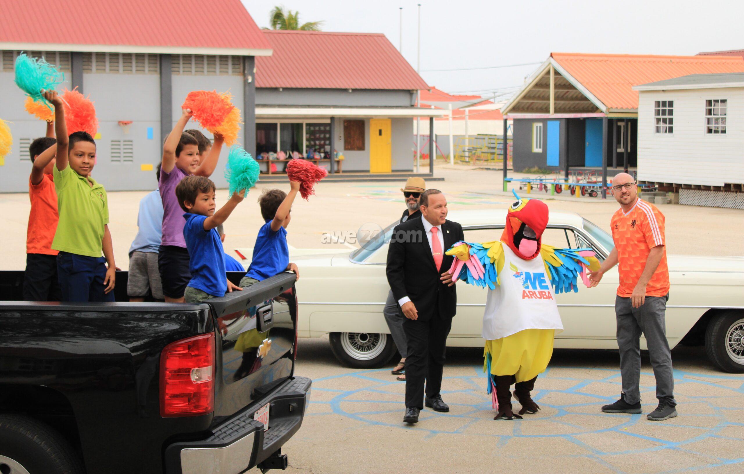 ORANJESTAD: Dialuna den ora tempran di mainta Minister Endy a compaña WEWE, e mascota di Weganan Escolar pa un bishita di cortesia na Mon Plaisir Basisschool en conexion cu WE 2022 cu ta cuminsa diabierna awo. Falta algun dia pa WegananEscolar 2022 inicia unda cu mas di 1200 mucha di binti diferente scol ta participa den ocho diferente disciplina for di 17 pa 25 di juni. E muchanan a keda encanta cu WEWE. Tur e docentenan a bisti awe mainta un uniform di un of otro deportemanera; karate, tennis, basket pa nombra algun. WEWE a invita e alumnonan y nan mayornan pa e gran apertura di WegananEscolar cu ta tuma luga diabierna awo cuminsando pa 6’or di atardi den Compleho Deportivo Guillermo Prospero Trinidad naDakota. Masha danki na e docente y alumnonan di Mon Plaisir School pa e bunita mainta. 4D