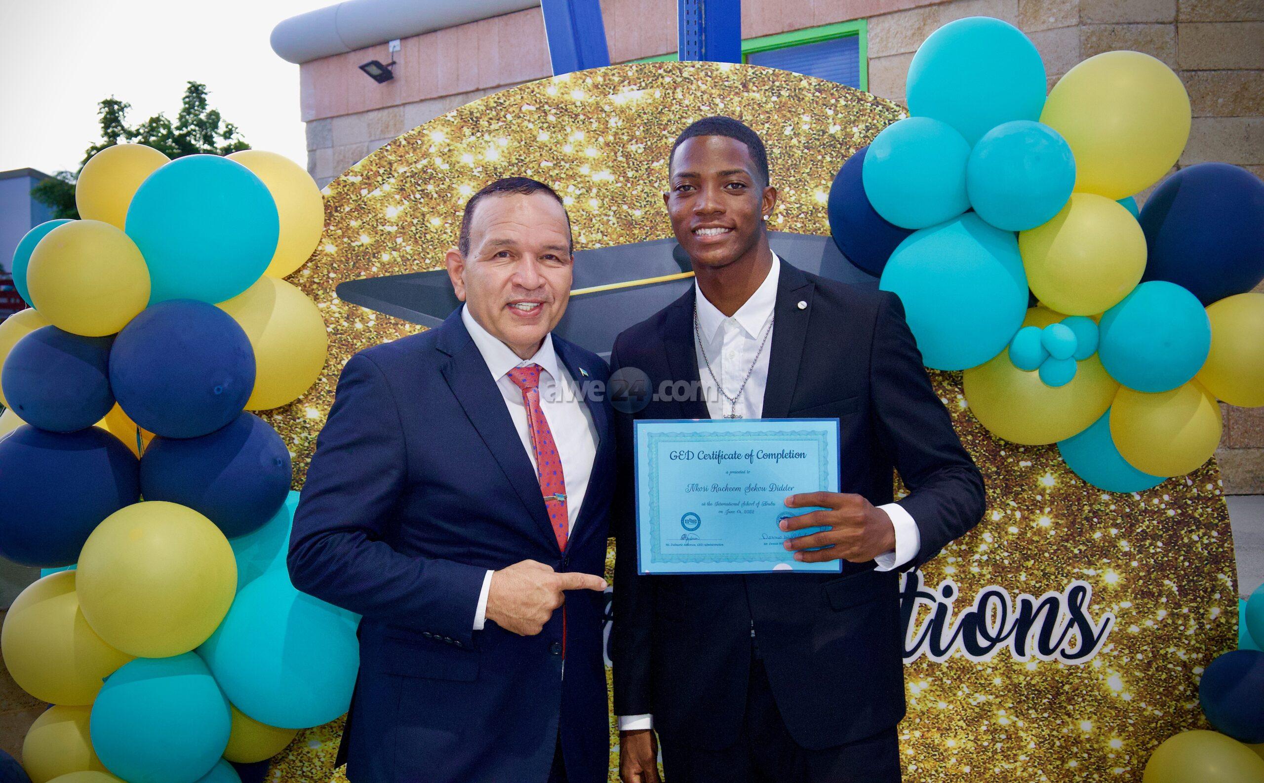 ORANJESTAD: Diamars atardi Minister Endy Croes tabata presente na International School of Aruba pa e ceremonia di graduacion di 42 studiante cu a finalisa e ‘General Educational Development (GED) program’ exitosamente. Hunto cu director di e scol sr. Dennis James Willeford,Minister Endy Croes a haci entrega di e diploma na e graduadonan. Un ceremonia cu a trece hopi alegria tanto pa e studiantenan como nan mayornan cu ta sostene nan yiu.Durante e anochi ameno aki Minister Endy Croes tabatin e honor di hiba un discurso pa e graduadonan.
