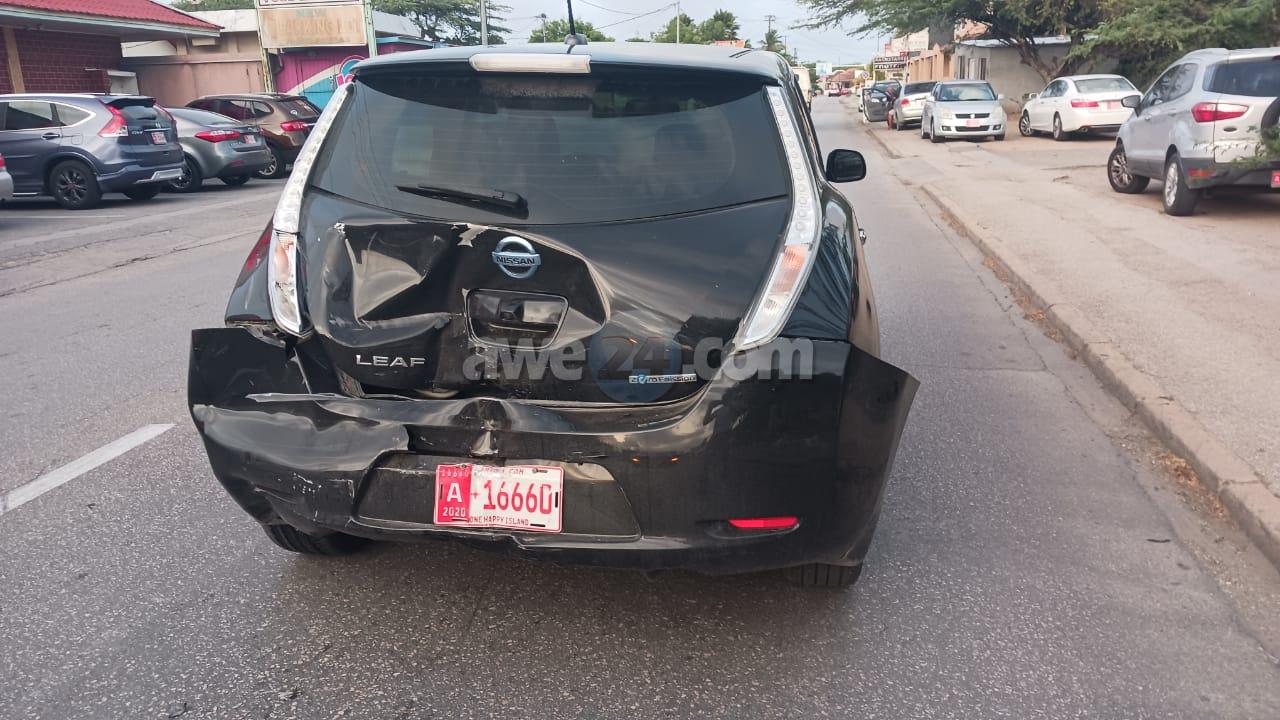 Diamars atardi a drenta informe di un accidente dilanti di Lee Feng Supermarket na Caya G.F. “Betico” Croes, mesora a dirigi un patruya na e sitio. Na yegada di e patruya a bin compronde cu aki ta trata di un accidente unda cu e chauffeur di un Renault s.u.v. no a regula su velocidad ni a mantene distancia a bay dal tras di e Nissan Leaf. Afortunadamente ningun hende a resulta herida.