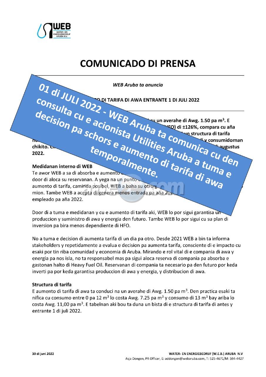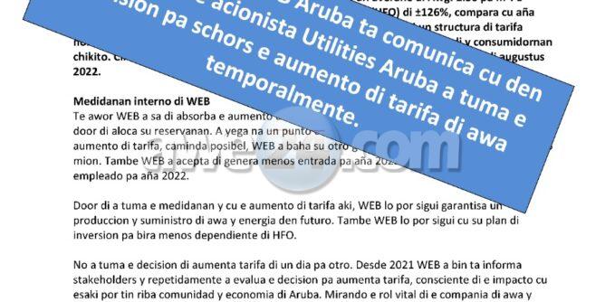 Posted in INCIDENTE W.E.B. ta schors e aumento di tarifa di awa 08:36 July 1, 2022 Leave a comment Related Articles Mas control den trafico, varios boet a cay! Polis a yuda homber pata pata cu tabata riba caya banda di Plaza Daniel Leo Dama chauffeur ta perde control di KIA Rio bayendo pariba riba Green Corridor bay dal den e median y bolter. Fredric Every como sospechoso lo pasa anochi den cel y riba cama di beton!