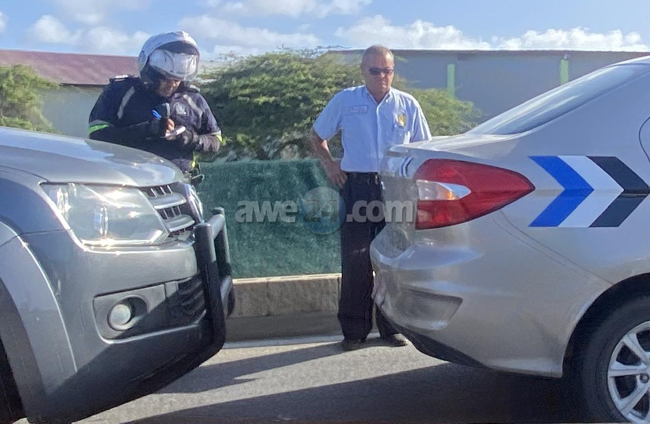 Diamars atardi un oficial di e brigada motorisa yegando e rotonde banda di Acero riba E.J. “Watty” Vos blvd. a topa cu un accidente cu a caba di pasa, mesora a para pa atende. Ta trata aki di un accidente unda cu e chauffeur di un pick-up no a regula su velocidad ni a mantene distancia a bay dal tras di e auto di security su dilanti. Afortunadamente ningun hende a resulta herida.