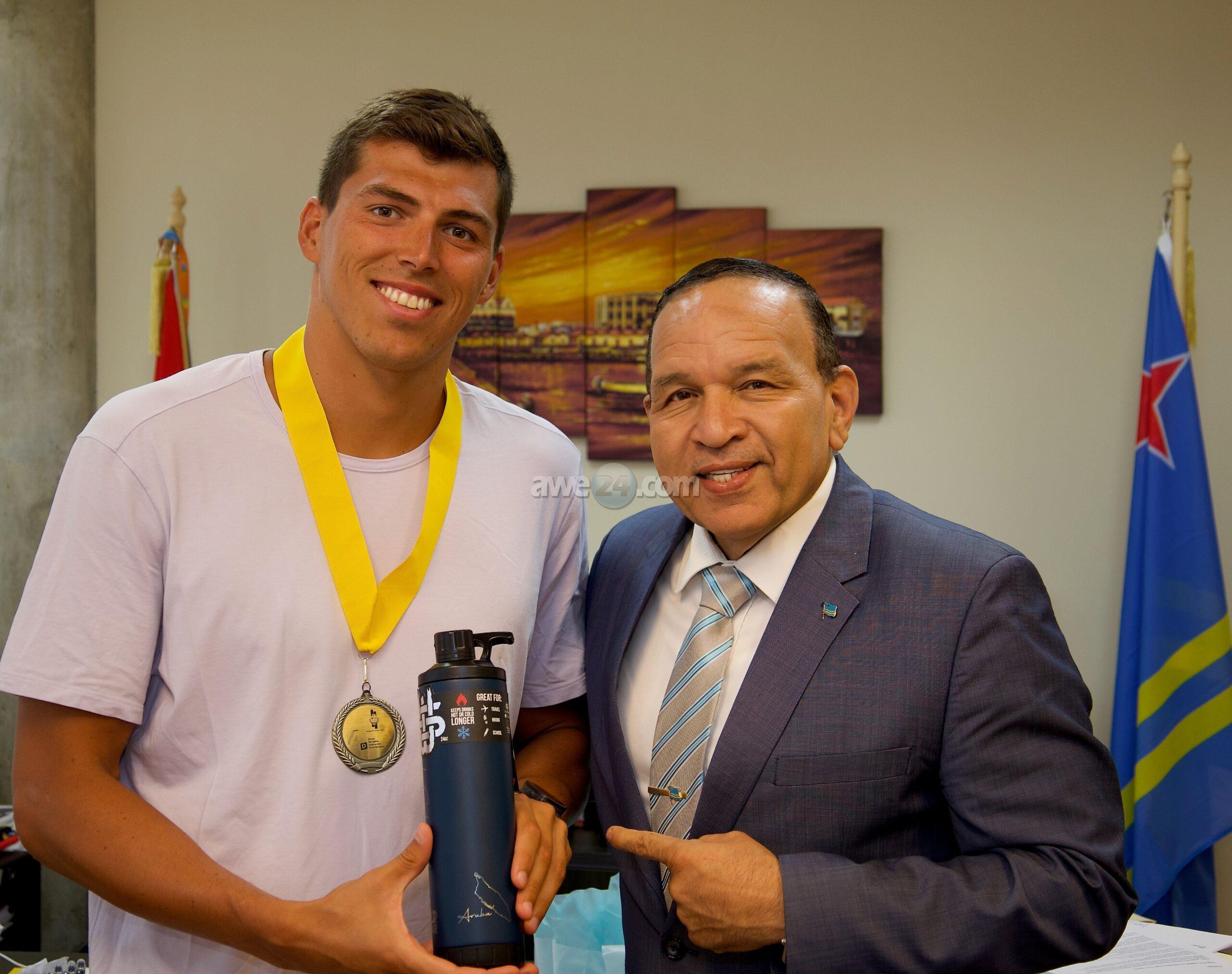 ORANJESTAD: Dialuna ultimo Minister Endy Croes a ricibibishita di cortesia di e atleta mundial di landamento Mikel Schreuders kende ta di vacacion riba nos isla. ActualmenteSchreuders ta bibando na Francia unda e ta preparando pa e Weganan Olimpico Paris 2024. Durante e encuentro amenonos a combresa extensivamente riba Mikel su preparacion pa su proximo competencianan. Den luna di juni di e aña akiMikel Schreuders a competi na e 19th FINA World Championship cu a tuma luga di 19 pa 25 di juni na Budapest, Hungary. Dia 19 di juni Schreuders a competi den 200 ‘freestyle’, unda e la keda na di 24 luga. Dia 20 di juniSchreuders a landa e 50 ‘breaststroke’ y a logra e impresionante record di 13 luga den mundo. Dia 21 di juniMikel a landa 100 ‘freestyle’ y a logra 15 luga den e semifinal. E fin di siman aki Schreuders lo ta competiendo naAruba.