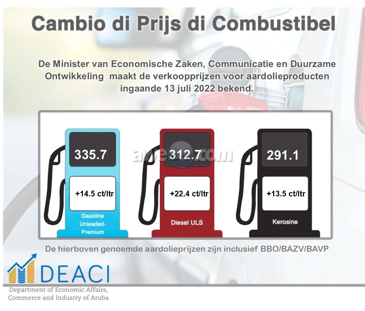 ORANJESTAD – Minister di Asuntonan Economico, Comunicacion y Desaroyo Sostenibel ta anuncia e prijsnan di benta pa combustibel entrante 13 di juli 2022: