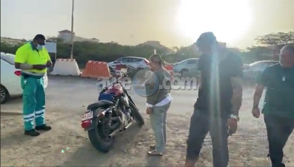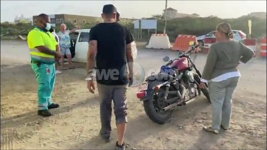 Diaranson atardi a drenta informe di un accidente cu hende levemente herida riba e caminda grandi pazuid di Palm Beach Plaza, mesora a dirigi tanto polis como ambulans na e sitio. Na yegada di e patruya ya caba ambulans tabata na e sitio y a atende e motociclista levemente heridA na e sitio mes. Locual a sosode ta cu ambos tabata bayendo zuid y e motociclista a bay pasa e auto y e auto a yega tuma un birada sin señal y sin spera a dal e motociclista bente abao y a herida su mes levemente na su pia.