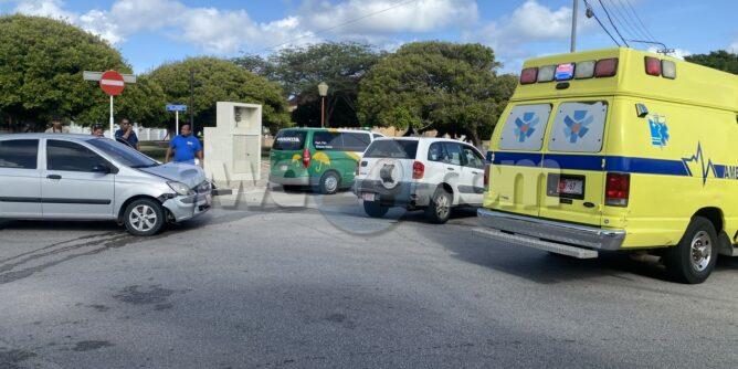Diamars mainta a drenta informe di un accidente cu hende herida na e crusada Rumbastraat/Stadionweg, mesora a dirigi un patruya na e sitio. Na yegada di e patruya a bin compronde cu aki ta trata di un accidente unda e dama chauffeur di un Toyota Rav cu tabata bini for di Rumbastraat no a duna preferencia na e dama chauffeur di e Hyundai Getz den Stadionweg. Na yegada di e ambulans a atende ambos victima na e sitio mes ya cu nan a resulta levemente herida.