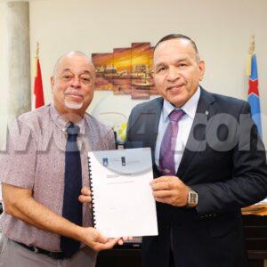 ORANJESTAD: Diaranson ultimo Minister Endy Croes a ricibi Inspector General di Aruba sr. John Hessen unda cu oficialmente manera a keda palabra cu Hulanda a haci entregana e mandatario di Enseñansa di Doorlichting van het Arubaanse Onderwijsbestel. Eindrapportage: Van plan naaraanpak. Na luna di december 2021 Inspectie di Hulanda y Inspectie di Aruba a entrega e Tussenrapportage. Dichorapport a wordo publica fin di januari di e aña aki y den palabracion cu Hulanda a determina cu fin di luna di september / october Aruba lo haya e rapport final. Inspectie di Hulanda tabata na Aruba na dos diferente occasion: na luna di april y juni / juli pa haci e ultimo investigacion y entrevistanan cu tur “stakeholders” den e veld di enseñansa. E rapport tin tur e investigacionnan di enseñansa en general naAruba, leynan di enseñansa, tipo di enseñansa, “doorstroom” voorschool y naschool. E investigacion a produci un total di 13 recomendacion cu tin cu bay traha riba nan. Minister EndyCroes a enfatisa cu ta trahando riba algun di e recomendacionnan aki caba. Concluyendo Minister EndyCroes ta gradici Inspectie di Aruba como tambe di Hulanda pa nan trabounan haci na bienestar di enseñansa den su totalidad.