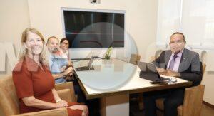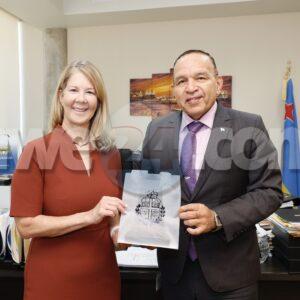 ORANJESTAD: Siman pasa mandatario di Enseñansa a ricibi bishita di Consul General di Merca na Curaçao, sra. Margaret Bond. Den un esfera ameno a reuni unda combersa hopi amplio riba riba diferente topiconan manera e.o. colaboracion entre Merca, Aruba y EducationUSA Aruba. A dialoga riba e posibilidadnan pa un scol na Ingles cu nan a cuminsa como scol piloto na Curaçao pa scol preparatorio y basico na unda Merca a inverti den e proyecto aki. Ta bay sondea posibilidad pa Aruba tambe wordo brinda un oportunidad asina. Concluyendo Minister Endy Croes a enfatisa cu e tabata un bon reuion; nos ta trahando pa estrecha e laso riba colaboracion riba diferente tipo di proyectonan enfocando riba deporte y enseñansa.
