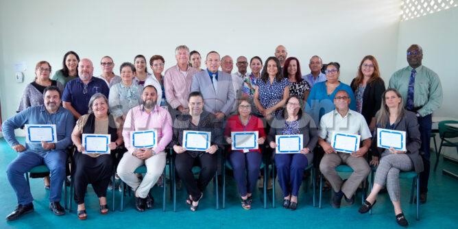 E participantenan tabata hopi contento, entusiasma y aencanta e manera con Profesor de Vries a trece e lesnan comotambe facilita y comparti su experticio cu nan. Na final di e mainta sra. Sheila Maduro, Directora Suplente di DirectieOnderwijs y e cursistanan a sorprende Profesor de Vries un regalo di aprecio; un bunita coleccion di stampia di mas nobodi Aruba. Concluyendo Minister Endy Croes ta mandapalabranan di pabien na tur e cursistanan cu a finalisa e cursocu exito. ‘Nos ta para pa SDG 4 y “Life Long Learing” y noskeda percura pa trece curso pa nos hendenan’, Mandatario di Enseñansa a finalisa.