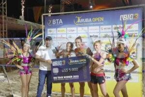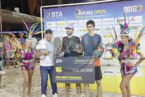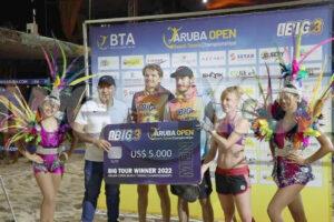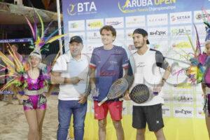 ORANJESTAD: Pa un siman largo tuma luga e torneo di Aruba Open Beach Tennis Championships 2022 unda cu 1200 atleta di 40 diferente pais a bataya pa conkista e titulo maximo. Bushiri Beach un biaha mas tabata scenario di e torneo mas popular di mundo y cu premionan balora na e suma total di $60,000.00. Tabata un siman hopi interesante y cu hopi ambiente. Diadomingo ultimo e stadion na Bushiri Beach tabata completamente yen di publico presenciando e diferente weganan y e final cu a termina alrededor di 2’or di marduga. Despues di e increibel final Minister Endy Croes a entrega premio na e ganadonan di Aruba Open Beach Tennis 2022. Minister Endy Croes ta felicita Sjoerd de Vries, organisado di Aruba Beach Tennis, ekipo, boluntario, patrocinadonan y tur esunan cu a haci e competencia uno sumamente exitoso! Masha pabien na e ganadonan.