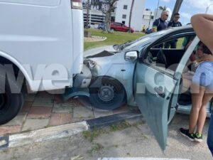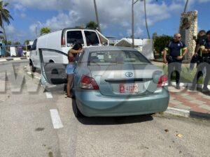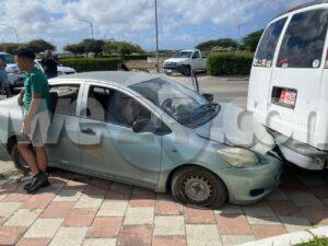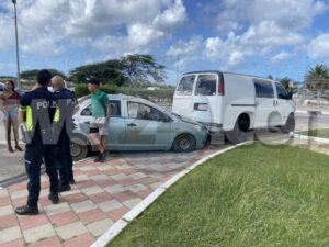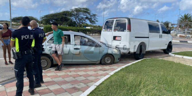 Diasabra mainta a drenta informe di un accidente banda di Cas di Cultura, mesora a dirigi un patruya na e sitio. Na yegada si e patruya a bin compronde cu aki ta trata di un accidente unda cu un chauffeur cu tabata bao influencia tumando e lorada di e rotonde biniendo cu velocidad cu e Toyota Yaris y no a logra tuma e lorada y a subi acera dal un van staciona. Afortunadamente ningun hende a resulta herida. Como cu e chauffeur kier a cambia cu e no tabata na stuur pero hopi testigo a wak e polis a advirtie pa no haci esey ya cu e lo por wordo deteni.