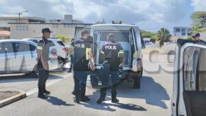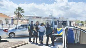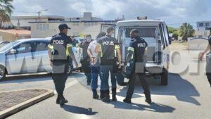 Dialuna merdia despues di cu un dama cu a ser agredi pa su ex-pareha e anochi anterior y a bay entrega keho di maltrato cu menasa na recherche contra e homber cu ta un security di un banco, recherche a emiti un peticion pa buskeda y detencion di e sospechoso J.J. kende ta traha como security di C.M.B. Polisnan incognito a spot y sigui e auto di banco nan a pidi pa patruyanan riba caya den centro di Oranjestad pa para e auto y detene e sospechoso. E sospechoso a yega te na su trabao y eynan pa tur precaucion a mand’e plat na tera pa asina imposibilite pa tuma cualkier accion descabeya. Na e parkinglot dilanti Landsloterij a bay na e auto di e sospechoso y a busca wak si pir logra haya e arma. Polis a pidi e vehiculo di transporte pa asina hib’e na warda di Santa Cruz pa recherche atende cun’e.