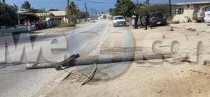 Diadomingo atardi a drenta informe di un accidente unda un auto lo a dal un palo di lus kibra, mesora a dirigi un patruya na e sitio. Na yegada di e patruya a bin compronde cu aki ta trata di un chauffeur cu a desvia pa un auto cu a bira su dilanti ela baha caminda na man drechi subi acera y a dal un palo di sosten kibra y tambe e muraya di e compleho di apartamento. Esaki pone cu waya tabata colga riba e caminda stroba trafico. Polis a nota cu e chauffeur parce ta bao influencia y a purba pone supla pero como e no tabata tin suficiente rosea y no por a supla largo suficiente a hib’e pa test na e aparato na warda y a keda constata cu e no ta burachi y un rato despues a lague den libertad.