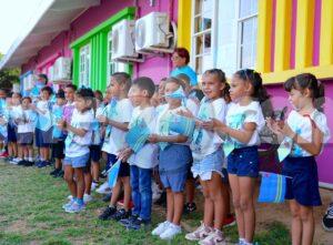 ORANJESTAD: Diahuebs ultimo, en conexion cu Dia di Himno y Bandera, Minister Endy Croes a bishita den oranantempran di mainta scol preparatorio Nos Paraiso. Na yegada e dignatario a wordo ricibi pa cabesante di scol, Sra. Lilian de Kort – Boekhoudt, alumno y docentenan. E mainta a inicia cu canto di nos Himno Aruba Dushi Tera, sigui pa Himno di scolNos Paraiso canta pa e alumnonan. Despues, Minister Endy Croes a haya un breve recorido di e scol. E mainta placenteroa continua den e gymzaal, unda cada klas a duna unpresentacion. E alumnonan a canta y declama poesia dedicana nos dushi pais Aruba. Sra. Lilian de Kort – Boekhoudt, cabesante di Nos Paraiso a expresa di ta hopi contento y alabes ta gradici Minister Endy Croes pa su bishita na e scol. Concluyendo, Minister Endy Croes ta gradici cabesante di Nos Paraiso, Sra. Lilian de Kort – Boekhoudt cu tin hopi añaden enseñansa di Aruba, educando nos muchanan, cu hopiawe ta profesionalnan. Como tambe palabra di gradicimentona docente y alumnonan pa e caluroso y bunita recepcion.
