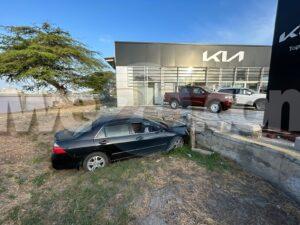 Diadomingo madruga a drenta informe di un accidente banda di Topcar na Caya Ernesto Petronia, mesora a dirigi patruya na e sitio. Na yegada di e patruya a bin compronde cubun chauffuer a baha caminda subi acera y bay cay den e rooi panort di e Santana Catolico na Oranjestad. Polis a nota cu e chauffeur tabata mustra burachi y a detene. Afortunadamente ningun hende a resulta herida.