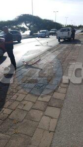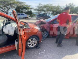 Diadomingo atardi un ciudadano tabata yamando central si polis pa alerta polis di un auto coriendo masha malo mes for di Palm Beach y tabata bay varios biaha otro banda di caminda treciendo trafico den peliger, pero aparentemente no tabata tin patruya disponibel y ta te na L.G. Smith blvd. ora ela accidenta a manda patruya como ambulans. Na yegada di e patruya a bin compronde cu e dama chauffeur di e Hyundai Accent a bay na man robes dal den banda di e pick-up Mitsubishi L200 aunke e chauffeur di e pick-up a purba kita p’e toch ela dal e pick-up despues e Accent a sigui na e banda robes y a dal semi-frontal cu un Hyundai Grand i10. Debi na e impactonan aki 4 persona a resulta herida pero unicamente 2 persona a ser transporta cu ambulans pa hospital.
