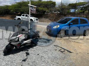 Diamars merdia a drenta informe di un accidente cu hende herida na Cumana, mesora a dirigi tanto polis como ambulans na e sitio. Na yegada di e patruya a bin compronde cu aki ta trata di un accidente unda cu un auto a bay bira na man robes pero e no a mira e scooter cu tabata bini atras y a bay pas’e mientras e motociclista a purba di kita p’e pero e impacto tabata in-evitable. Debi na e impacto cu caida e motociclista a resulta herida. Na yegada di e ambulans nan a atende e victima pero e victima mes no kier a bay hospital y a firma cu ela nenga.