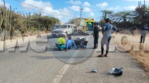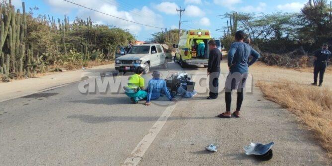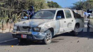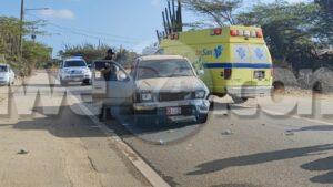 Diaranson mainta a drenta informe di un accidente cu hende herida na Barcadera, mesora a dirigi tanto polis como ambulans na e sitio. Na yegada di e patruya a bin compronde cu ki ta trata di un accidente unda cu un postbode a core trot bay pa un cacho riba caya cu a bay pa atak’e no yeg’e pero ela bay dal riba un pick-up pasando. Debi na e impacto aki ela dal abao y herida su mes. Na yegada di e ambulans nan a atende e victima y a transporte pa hospital. Na prome instante polis kier a detene e chauffeur pasobra e no por a mustra ningun identificacion pero despues di un rato e identifacion a aparece y no tabata necesario mas pa detene e chauffeur.
